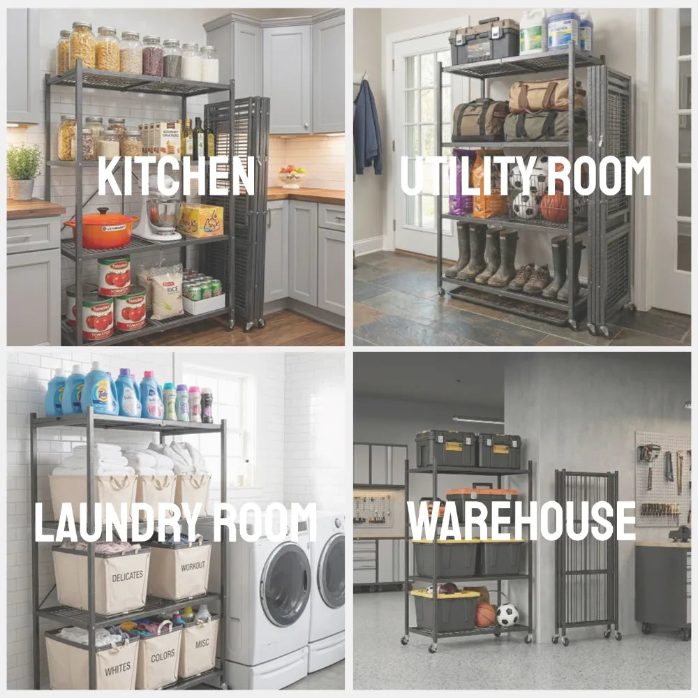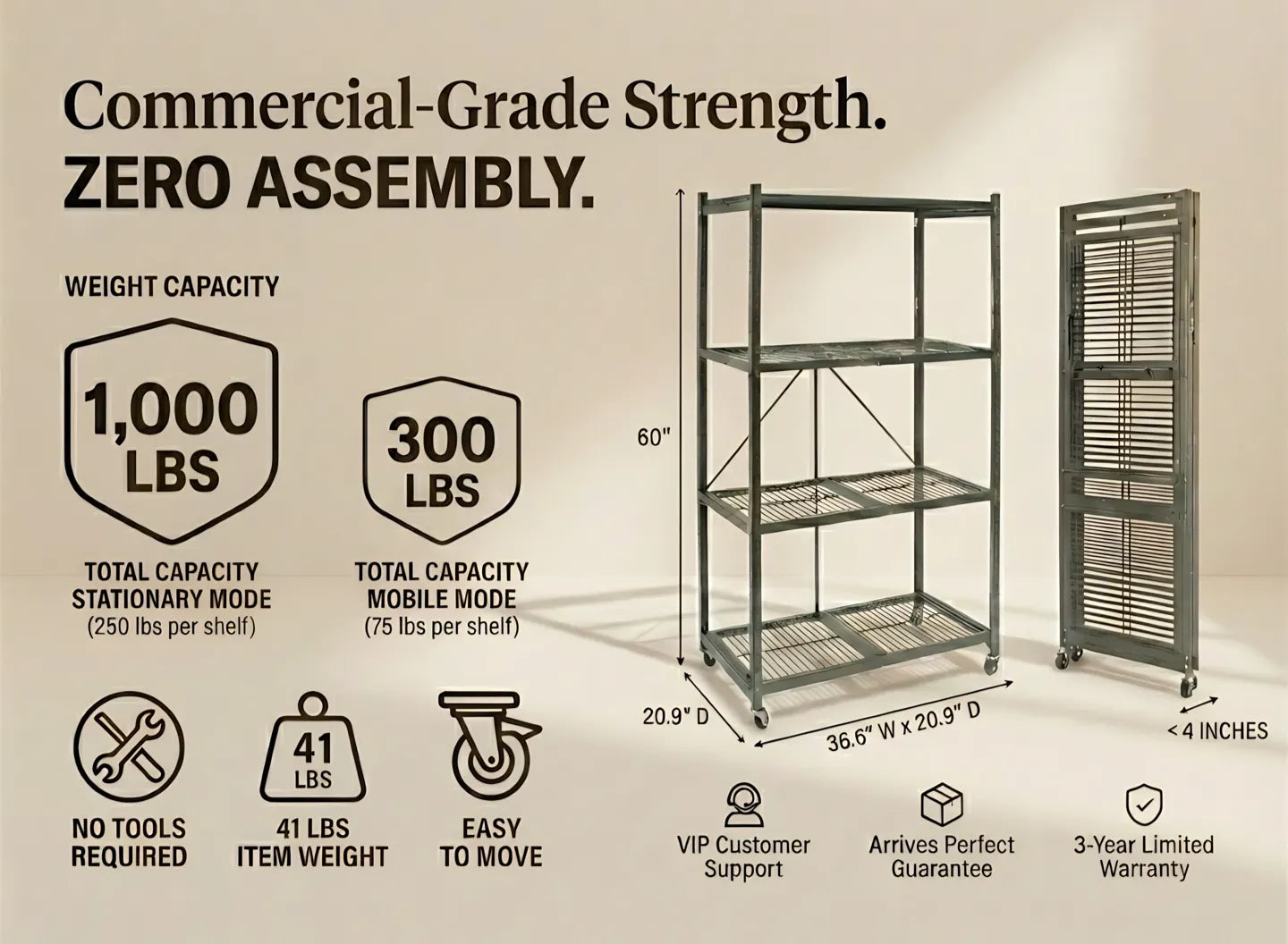 Unfolds in seconds—no tools required. Crafted from heavy-duty commercial steel, each tier supports up to 250 lbs. From heavy power tools to delicate linens, it’s an instant, sturdy upgrade for your garage, pantry, or office.