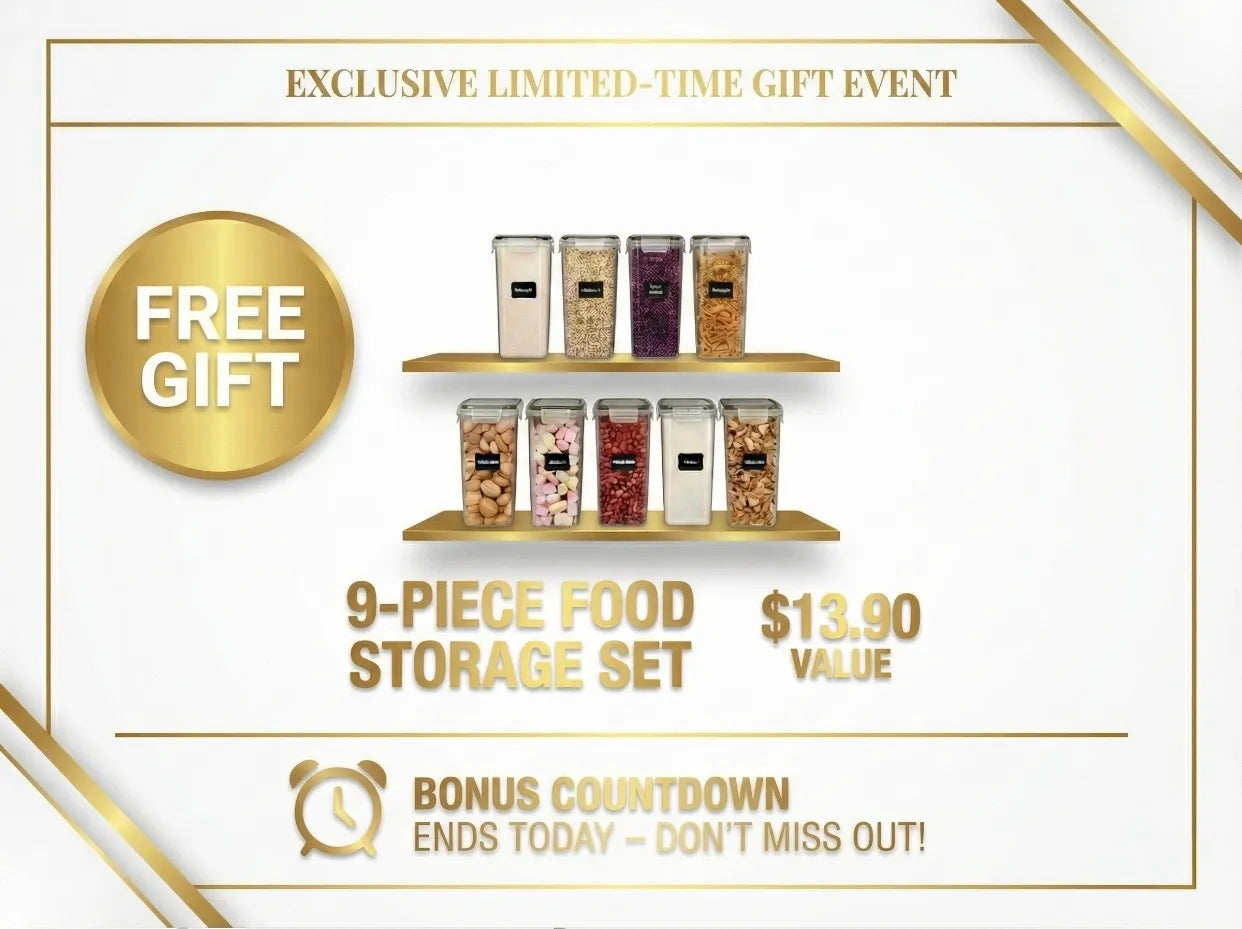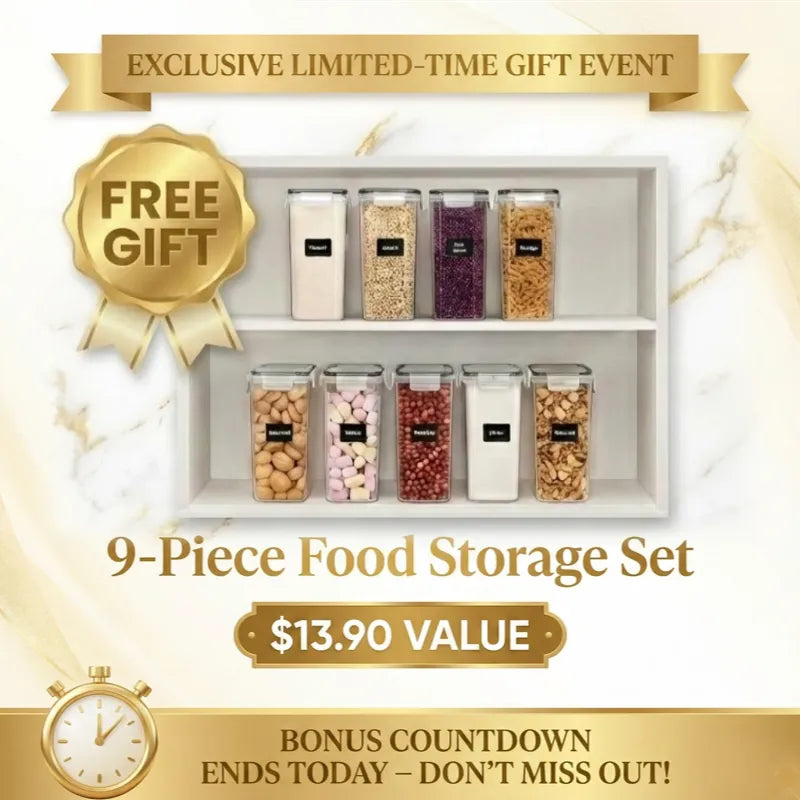 Free Bonus Gift: Receive a 9-piece airtight food storage set (valued at $13.90) at no extra cost.